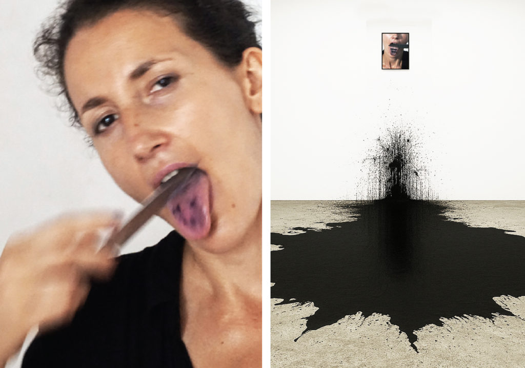 I wrote 8 phrases on 8 different knives in Bulgarian, my mother tongue. For six hours, I cleaned all the knives by licking them with my « mother » tongue until the written phase disappeared. I « shaved » and « cleaned » my tongue us well. I « sharpen’d » it like a pencil. And spit out the ink.